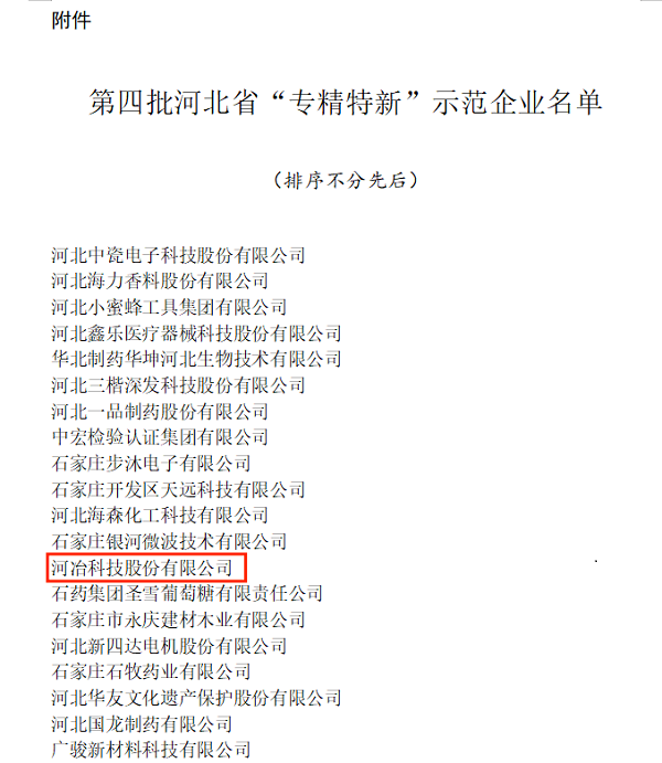 2021年12月30日,河北省工業(yè)和信息化廳發(fā)布了《關(guān)于公布第四批河北省“專精特新”示范企業(yè)的通知》(冀工信企業(yè)函〔2021〕1029號)。通過前期申報,河冶科技股份有限公司通過了市級、省級的嚴格審核,被認定為河北省“專精特新”示范企業(yè)。